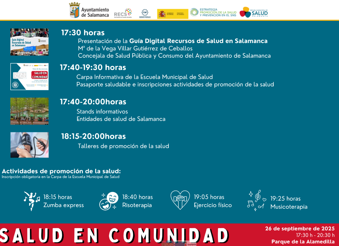 | Además, durante la tarde, se llevarán a cabo diversas actividades de promoción y prevención de la salud, entre ellas: Zumba, Risoterapia, Ejercicio Físico y Musicoterapia ⚠️ Cada taller tendrá un aforo limitado a 20 personas, por lo que será necesaria inscripción previa en la Carpa de la Escuela Municipal de Salud. ![]() Os animamos a compartir esta invitación con familiares, amistades y conocidos, para reunir al mayor número posible de personas en esta jornada comunitaria. |